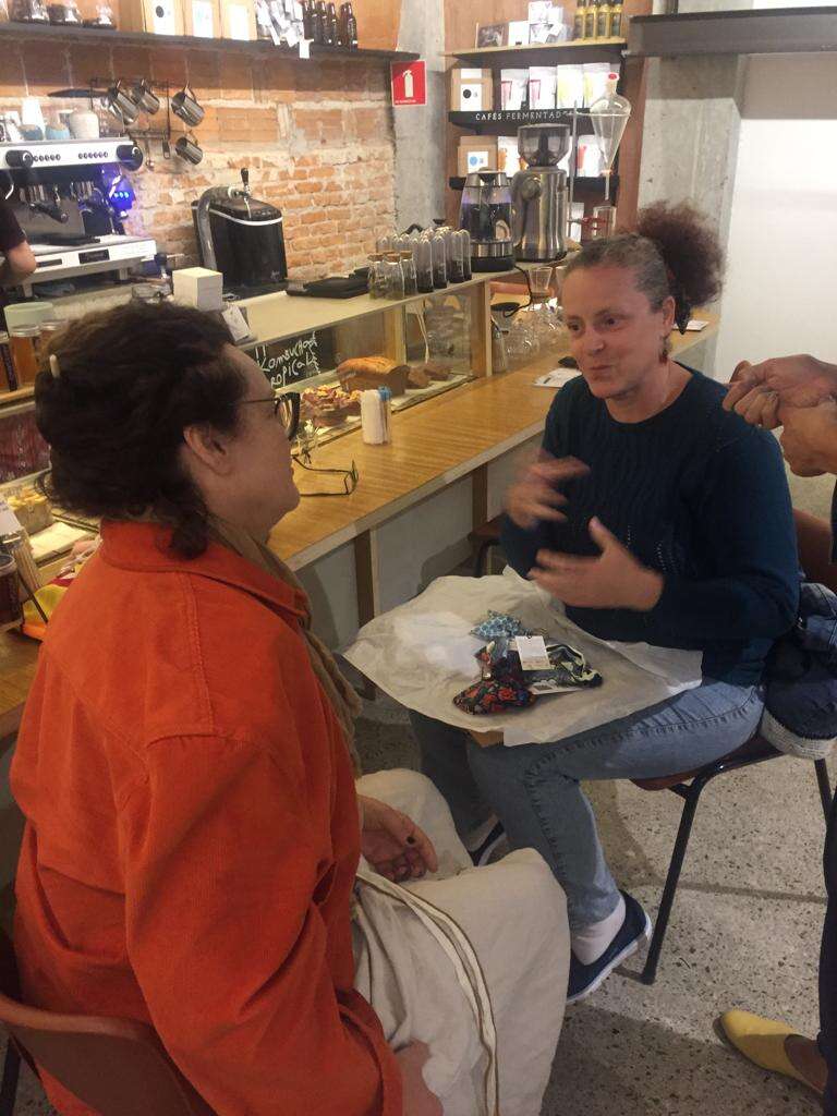 Luciene, artesã da CriaNorte negociando com Betty Prado, sócia fundadora da Bemglô com a Glória Pires, a inclusão dos produtos da Rede na loja colaborativa da marca